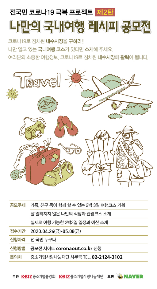 중소기업사랑나눔재단은 코로나19로 어려움을 겪는 소상공인들의 경영 활성화를 위해 국내 숨겨진 맛집과 관광지를 소개하는 '나만의 국내여행 레시피' 공모전을 개최한다고 27일 밝혔다.