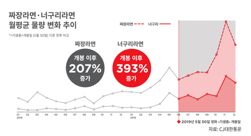 영화 '기생충'의 영향으로 '짜파구리'가 큰 인기를 끌며 2018년 당시 전체 라면 배송 물량 중 8%를 차지했던 짜장라면과 너구리라면 비중은 지난해 19%까지 늘기도 했다.