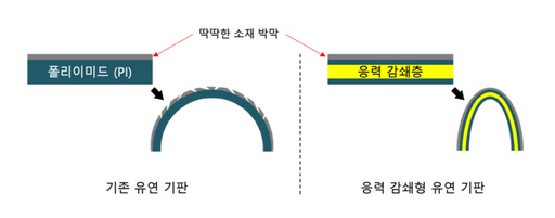 전자기기에서 소자가 놓이는 기판 내부에 부드러운 물질 층을 삽입해 딱딱한 물질을 부드럽게 구부릴 수 있게 만드는 새로운 개념의 유연기판이 개발됐다.