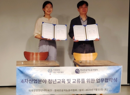 한국인공지능윤리협회는 지난 11일 미래경영청년네트워크에서 주최하고 서울시 청년청에서 후원한 '인간, 공존으로 지식을 능가하다' 멘토 토크콘서트에서 미래경영청년네트워크와 '인공지능(AI) 청년 교육 및 교류를 위한 공동 사업 업무협약'을 체결했다고 15일 밝혔다.