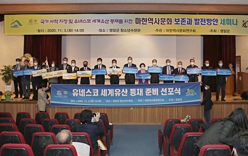 전동평 영암군수는 유네스코 세계유산 등재 준비 선포식과 이어진 세미나에서 "올해는 마한역사문화권 특별법 제정이라는 큰 쾌거와 함께 지금의 마한문화 발전을 위한 견고한 토대가 마련된 가장 중요한 시기"라고 강조하면서 "유네스코 세계유산 등재라는 공통목표를 위해 마한의 후예인 우리가 가야할 길이 난관은 있을 수 있지만 착실하게 준비해서 유네스코 등재라는 크나큰 위업을 달성하기를 기원하며 오늘 선포식을 계기로 세계사적인 우수한 역사적 가치로 자리매김 할 수 있기를 기대한다."며 "함께 협력해 나간다면 괄목할만한 큰 성과를 거둘 것을 확신하며 영암군에서도 마한의 새로운 천년을 위해 적극 지원해 나가겠다."고 밝혔다.