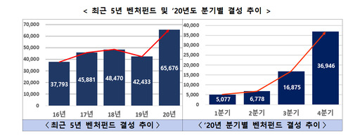 중소벤처기업부가 '2020년도 벤처펀드 결성 실적'을 분석해 14일 내놓은 자료에 따르면 지난해 신규 결성된 벤처펀드는 6조5676억원으로 역대 최대 실적을 기록했다.