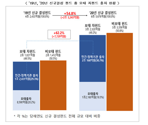 지난해 신규 결성펀드 6조5676억원 가운데 모태 자펀드는 3조2320억원(49.2%)이었다. 이 금액 중 모태출자는 1조2160억원, 민간·정책기관 출자는 2조160억원으로 집계됐다.