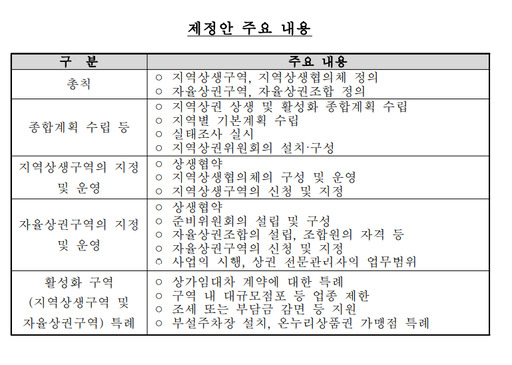 이를 위해 ▲중기부 장관이 지역상권 상생 및 활성화 종합계획 3년마다 수립·시행 ▲활성화구역 지정·운영에 필요한 실태조사 ▲활성화구역 지원 근거 마련 ▲지역상생구역·자율상권구역내 이해당사자간 상생협약 체결 ▲상가임대차 계약에 대한 특례 ▲조세 또는 부담금 감면 지원 등의 내용을 담고 있다.