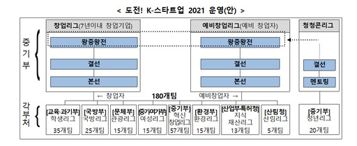 중소벤처기업부는 창업 분위기 확산을 위해 '도전! K-스타트업 2021'을 통합 공고하고 통합본선에 진출할 창업자 선발을 위해 10개 부처가 운영하는 9개 예선리그를 시작한다고 21일 밝혔다.
