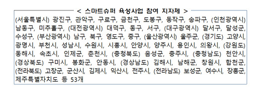 22일 중기부에 따르면 23일부터 오는 4월16일까지 모집하는 스마트슈퍼 육성사업에는 전국 53개 지자체가 참여한다.