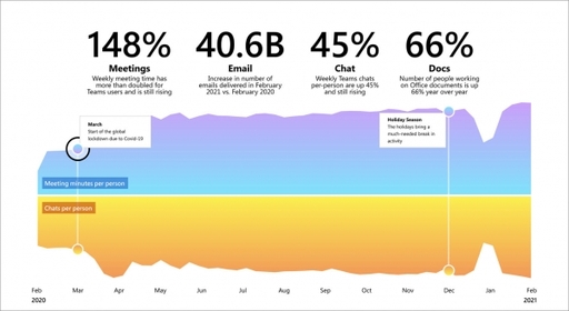 먼저 수십억 개의 아웃룩 전자메일과 팀즈 원격 미팅 등에서 발견된 익명화된 협업 동향은 원격 근무가 직장 내 인적 네트워크를 위축시켰다. 또 미팅 시간은 팬데믹 전보다 두 배 이상 늘었으며, 지난 2월 이메일 발송량은 지난해 동기 대비 400억개 이상 증가한 것으로 집계됐다.