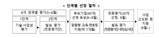 선정 절차에도 스타트업의 특성을 고려해 먼저 1차, 2차 평가를 통해 후보기업 40개사를 선정한다. 이 과정에서 대기업 전문가를 포함한 전문 멘토단이 교육과 멘토링을 지원한다.
