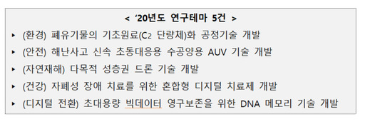 과학기술정보통신부는 '혁신도전프로젝트', 20년도 연구테마 5건에 대해 사업기간, 세부과제 등을 포함한 연구개발 계획 수립을 완료했다고 3일 밝혔다.