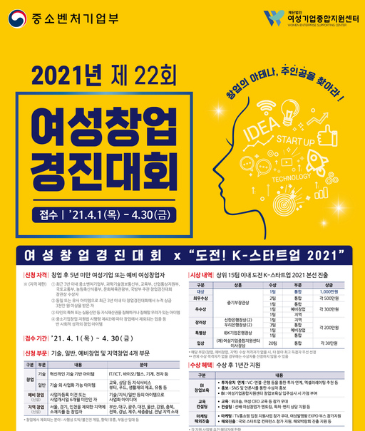 한국여성경제인협회 산하 여성기업종합지원센터는 우수 여성창업자 발굴 및 여성의 창업 활성화를 위해 지난 4월부터 모집한 '2021년 여성창업 경진대회'에 총 1292개팀이 접수했다고 20일 밝혔다.
