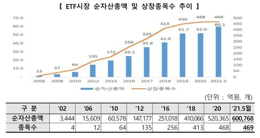 ETF 시장 몸집은 서서히 커지며 2006년 1조5609억원, 2018년 41조원, 지난해 52조원을 돌파했다. 순자산 뿐 아니라 상장 종목 수도 빠르게 늘어나는 추세다. 2002년 4개에서 2006년 12개, 2010년 64개, 2016년 2016개, 현재 469개까지 늘었다.