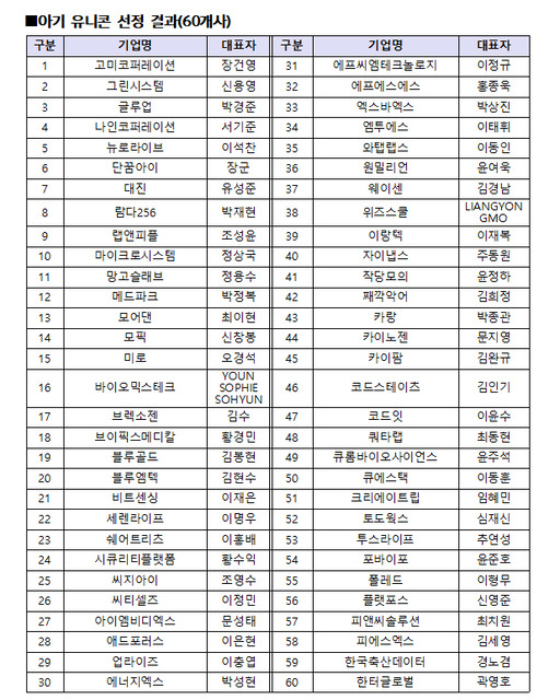 '아기유니콘200 육성사업'을 통해 아기유니콘 60개사가 뽑혔다.
