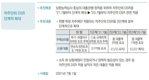 차주단위 총부채원리금 상환비율 적용대상도 7월부터 확대해 상환능력심사 중심의 대출관행 정착을 도모한다. 투기·과열지구 및 조정대상지역 등 에서 6억원 초과 주택을 담보로 주택담보대출을 받는 경우와 연소득과 관계없이 총 1억원을 초과해 신용대출을 받는 경우에도 차주단위 총부채원리금상환 비율이 적용된다.