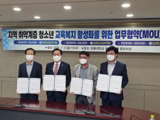 울진교육지원청(교육장 권오진)은 2021. 07. 2.(금) 안동대학교 다문화지원센터에서 '울진지역 취약계층 청소년 진로직업체험을 위한 업무협약(MOU)'를 체결하였다.