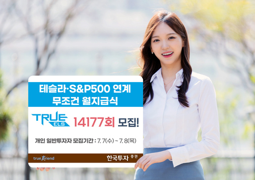 한국투자증권은 오는 14일까지 테슬라와 스탠다드앤드푸어스(S&P)500 지수를 기초자산으로 하는 '무조건 월지급식 TRUE ELS 14177회'를 총 70억원 한도로 모집한다고 7일 밝혔다.