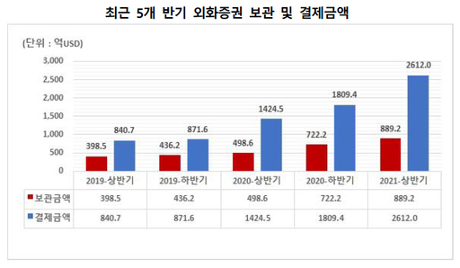 19일 한국예탁결제원에 따르면 2021년 상반기 외화증권 보관금액은 889억2000만달러, 결제금액은 2621억달러로 집계됐다. 특히 외화증권 결제금액은 직전 반기(1809억4000만달러) 대비 44.3% 증가했는데, 이는 2020년 연간 결제금액(3233억9000만달러)의 80.8%에 해당하는 수치다.