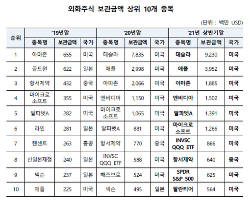 외화주식 보관금액 10개 상위종목에는 테슬라, 애플, 아마존 등 미국 나스닥 기술주 및 나스닥 100과 미국 대형주를 추종하는 ETF 등이 이름을 올렸다. 이 중 미국 주식이 차지하는 금액은 전체 외화주식 보관금액(658억8000만달러)의 32.3%를 차지했다. 10개 상위종목 중 미국 주식이 아닌 것으론 8위에 오른 중국 항서제약이 유일했다. 외화증권 결제금액은 2612억 달러로 직전반기(1809억4000만달러) 대비 44.3% 증가했다. 이는2020년 연간 결제금액(3233억9000만달러)의 80.8%에 육박하는 수치다.