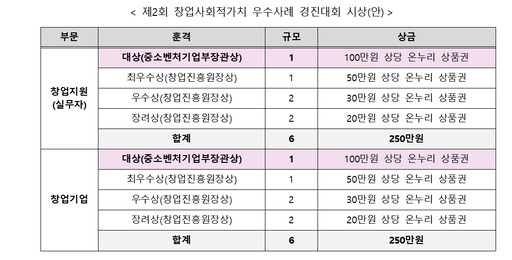 시상 규모는 12개팀(분야별 6개팀)으로 총 500만원(분야별 250만원)의 상금과 각 부문 대상에게는 중소벤처기업부장관상이 수여된다.