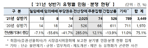 18일 한국거래소가 상반기 증권·선물업계에 접수된 민원·분쟁 건수를 분석한 자료에 따르면 증권선물업계 총 58사 중 28사에서 발생한 민원·분쟁건수(3449건)는 전년 동기(1970건)보다 75.1% 증가했다. 특히 전산장애가 526건에서 2025건으로 크게 늘었다. 주식시장의 거래규모 확대와 공모주 투자 열풍에 따른 단기간 거래량 집중 현상이 원인으로 꼽힌다.