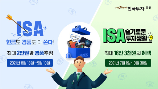 한국투자증권이 오는 9월 10일까지 뱅키스(BanKIS) ISA(개인종합자산관리계좌) '절세투자' 이벤트를 진행한다고 23일 밝혔다. 뱅키스는 비대면 또는 시중은행을 통해 개설 가능한 한국투자증권의 온라인 거래 서비스다.