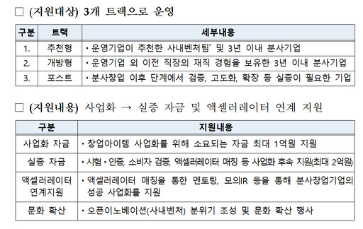중기부 관계자는 "운영기업이 추천한 사내벤처팀(분사기업)을 평가·선정해 최대 1억원의 사업화 자금을 지원하고 액셀러레이터 매칭 등 후속 사업화 지원도 제공할 예정"이라고 밝혔다.