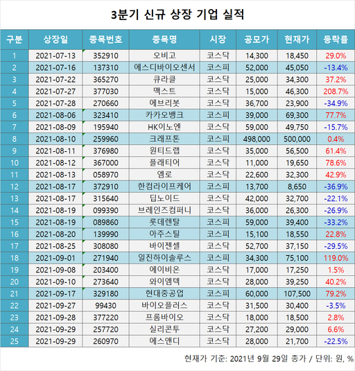 3분기 기업공개(IPO) 시장에서 올 들어 가장 많은 25개 기업이 상장한 것으로 나타났다. 카카오뱅크와 현대중공업 등 7개 대어(大魚)급 기업의 유가증권시장 상장이 포함되면서 공모 시장이 성황을 이뤘다. 공모 열기에도 새내기주 주가가 공모가를 하회하는 등 변동성도 확대되는 추세다.
