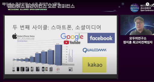 정지훈 모두의 연구소 최고비전책임자는 26일 온라인으로 개최된 '메타버스 얼라이언스 오픈 콘퍼런스'에서 '메타버스와 미래산업' 주제 발표를 통해 이 같이 밝히고 "첫 번째 사이클은 PC, 윈도. 인터넷 사이클로 거슬러 올라간다"고 밝혔다.