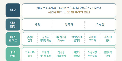 우리나라 전체 기업체수의 99.9%와 고용의 82.7%를 차지하고 있는 중소기업의 막중한 위치를 감안할 때 이들 기업이 현재 직면하고 있는 생산성 제고 한계, 시장의 불균형, 노동시장 이중구조, 불합리한 규제, 제한적 디지털 전환, 코로나19 위기 등의 숙제를 차기 정부에서 반드시 풀어내야한다고 강조하면서다.