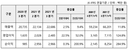 이번 3분기 매출은 3분기 실적 기준 역대 최대치다. 전년 동기 대비로 매출은 9%, 영업이익은 52%가 증가했다.