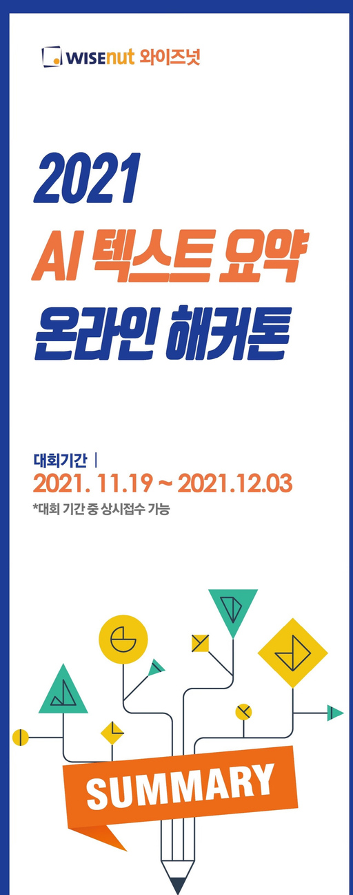 2021 인공지능 텍스트 요약 해커톤 대회는 와이즈넛이 지난 8월 과학기술정보통신부가 주관하고 한국지능정보사회진흥원(NIA)이 지원하는 2021년 인공지능(AI) 학습용 데이터 구축 사업 중 '요약 텍스트 데이터' 과제 주관기관으로 선정됨에 따라 후속 개최하는 행사다.