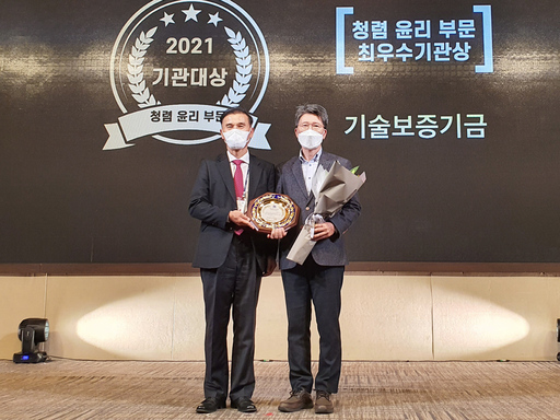'사회적가치실현기관 우수상'도 함께 수상기술보증기금이 2021 한국감사인대회에서 '기관대상 청렴·윤리부문 최우수상'과 '사회적가치실현기관 우수상'을 동시에 수상했다.