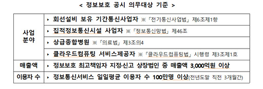 회선설비 보유 기간통신사업자, 집적정보통신시설 사업자, 상급 종합병원, 클라우드컴퓨팅 서비스 제공자 중에서 정보보호 최고책임자 지정·신고 상장법인에서 매출액 3000억원 이상, 정보통신서비스 일일 평균 이용자수 100만명 이상(전년도말 직전 3개월간)인 경우, 정보보호 공시를 의무화했다.