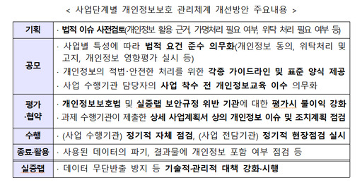 이 관리방안에는 ▲(기획단계) 개인정보 수집·활용 근거, 가명처리 필요 여부, 위탁처리 필요 여부 등 사전 점검 ▲(공모단계) 과제별 특성에 따라 위탁처리 및 고지, 개인정보 영향평가 실시 등 의무화 ▲(평가·협약단계) 사업 수행기관이 제출한 사업계획서 상의 개인정보 이슈 및 조치계획 점검 ▲(수행단계) 사업 수행기관의 자체적인 정기적인 점검 의무화 및 사업 전담기관이 그 점검결과를 토대로 정기적 현장점검 실시 ▲(사업종료 및 활용 단계) 사용 데이터의 파기, 결과물에 개인정보 포함 여부 점검 등을 의무화하기로 했다.