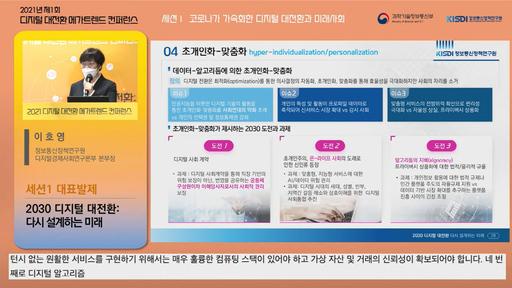 이호영 정보통신정책연구원 디지털경제사회연구본부장은 9일 온라인과 서울 포스트타워에서 개최된 '2021 제1회 디지털 대전환 메가트렌드 컨퍼런스'에서 '2030 디지털 대전환: 다시 설계하는 미래' 주제 발표를 통해 이 같이 밝혔다.