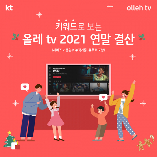 KT는 연말을 맞아 최근 1년간 900만 이상 가구가 이용하는 올레 tv의 장르별 빅데이터를 분석해 '2021년을 관통하는 3개 키워드와 분야별 시청 순위'를 21일 발표했다.