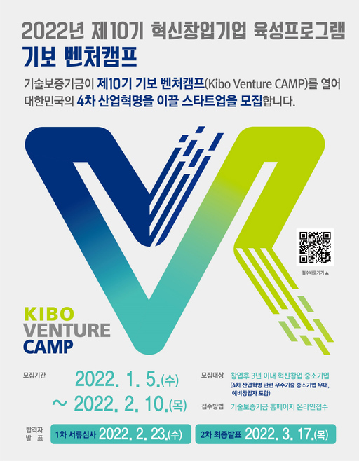 기술보증기금이 4차 산업혁명을 이끌어 갈 역량있는 혁신창업기업을 육성하기 위해 제10기 '기보벤처캠프' 참여기업을 모집한다.