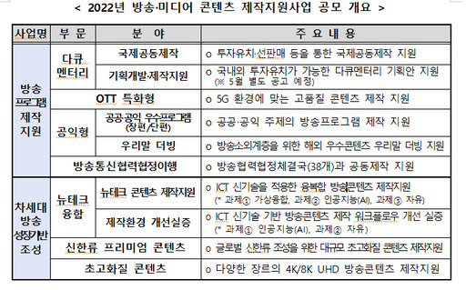 과기정통부는 국내 방송·미디어 콘텐츠 산업 경쟁력 강화를 위한 2022년도 제작지원사업을 18일 공고했다.