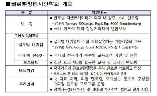 2020년 문을 연 글로벌 창업사관학교는 혁신적인 창업 아이템을 보유한 창업기업을 대상으로 세계 최고 수준의 역량을 보유한 창업기획자 밀착 보육, 국내·외 전문가들의 데이터(D)·네트워크(N)·인공지능(A) 분야 특화 교육, 최대 5000만원의 사업화 자금 지원, 업무 공간 및 해외 네트워킹 등을 통합 지원하는 프로그램이다.
