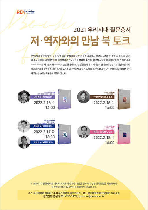 이번 행사는 코로나19 확산 방지를 위해 방역수칙을 철저히 지킨 가운데 현장 참여자는 접종완료자에 한해 최소화하고, 온라인 중계방식(ZOOM)을 병행해 운영한다. 현장 참가 신청은 부산대 출판문화원으로 문의하면 된다.
