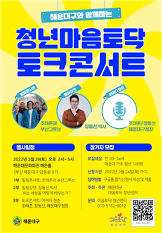 부산 해운대구는 '마음토닥 청년센터(센터장 박화영)'와 함께 26일 오후 2시 해운대문화회관 해운홀에서 '청년 마음토닥 토크콘서트'를 개최한다.