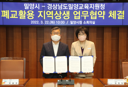 밀양시는 22일 경상남도밀양교육지원청과 폐교활용 지역상생 업무협약을 체결했다.