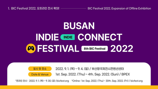 올해 8회를 맞는 BIC 페스티벌 2022는 부산항국제전시컨벤션센터에서 개최, 지난해보다 규모가 커질 예정이며 코로나 시대 이전의 열정이 넘치는 인디게임 축제의 현장을 다시 재현할 계획이다.