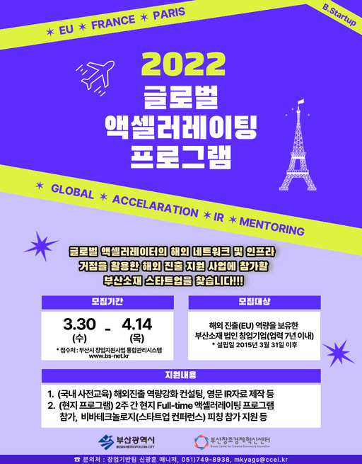 부산시와 부산창조경제혁신센터(이하 부산센터)는 글로벌 진출을 희망하는 지역 스타트업을 지원하기 위해 오는 14일까지 글로벌 액셀러레이팅 프로그램에 참여할 창업기업을 모집한다고 밝혔다.