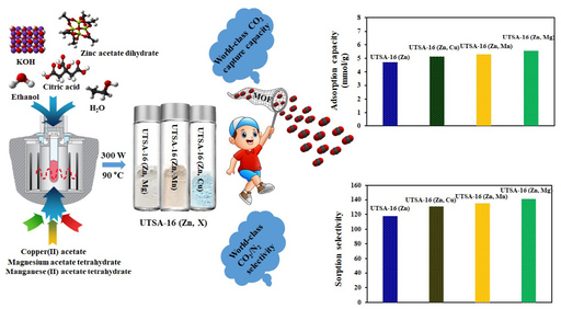기능성나노소재연구실이 기존에 개발한 UTSA-16(Zn)에 망간, 마그네슘, 구리 금속을 추가해 결정체를 합성했고, 그 결과 아연 대 금속 7:2의 비율로 합성했을 때 기존 UTSA-16(Zn)의 이산화탄소 흡착량 4.71 mmol/g, 이산화탄소/질소 선택도 118을 능가하는 세계최고 수준의 흡착량 5.56 mmol/g, 선택도 141의 값을 보여주는 bimetallic UTSA-16 (Zn, M)-(7:2) 합성에 성공했다.