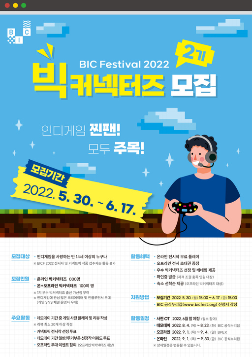 빅커넥터즈는 BIC 페스티벌과 커넥터즈(Connecters)의 합성어로, BIC 페스티벌과 인디게임 개발자, 게이머를 연결하는 구심점을 의미한다. 국내외 인디게임을 사랑하는 만 14세 이상의 게이머라면 누구나 지원 가능하며, BIC페스티벌 2022 현장에서 다양한 활동할 펼쳐나갈 예정이다.