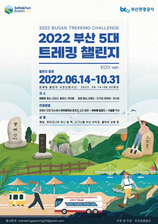 부산관광공사(이하 공사)는 엔데믹 전환을 맞아 지속 가능한 여행 방법인 '부산5대트레킹챌린지' 캠페인을 6월 14일부터 10월 31일까지 진행한다고 밝혔다.