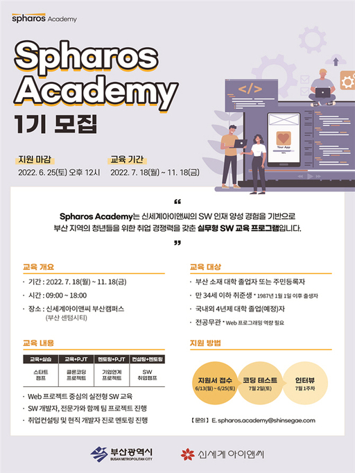 부산시와 신세계아이앤씨(대표 손정현)가 오는 7월 '신세계아이앤씨 부산캠퍼스' 정식 개소를 앞두고 '스파로스 아카데미(Spharos Academy)' 1기 교육생을 오는 25일까지 모집한다.