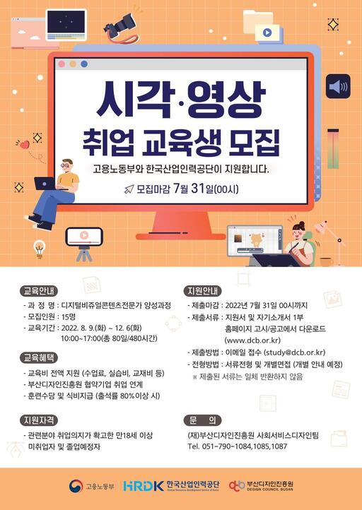 부산디자인진흥원은 디자인 혁신을 이끌 핵심 디자인 전문인력 양성을 위해 2022년 디지털비주얼콘텐츠 전문가 과정 취업 교육생을 오는 31일까지 모집한다고 밝혔다.