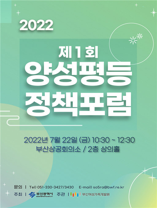 양성평등정책 포럼은 부산시민을 비롯해 다양한 분야의 전문가들과 양성평등 관련 최근 이슈를 공유하고, 대응 전략을 논의하는 자리다. 성평등 도시 조성 공감대 형성과 양성평등 문화확산을 위해 시와 부산여성가족개발원이 올해 처음으로 마련했다.