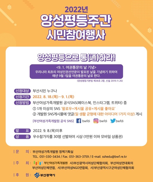 부산여성가족개발원이 '2022년 양성평등주간 시민참여행사'를 개최한다고 23일 밝혔다.